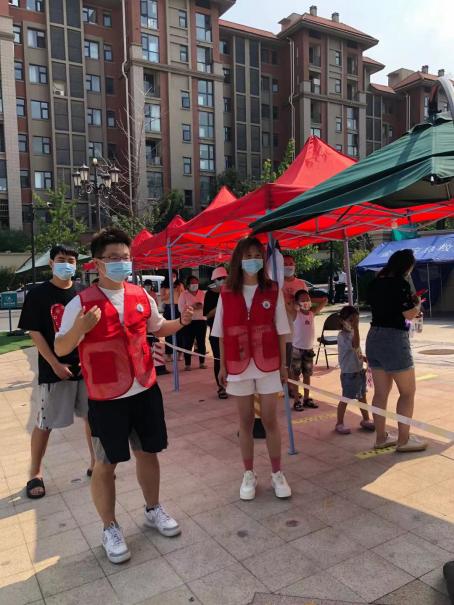 8月15日,郑州市启动第四轮全员核酸检测。我院学生党员会展181班杨宇航、造价182班靳燕鸽积极联系金水区兴达路街道鸿苑社区,为奋战在一线的医护人员、社区工作人员送去了矿泉水等物资。在现场,两位同学又披上红马甲,顶着酷暑当起了志愿者。他们一方面帮助工作人员维持现场秩序,一方面帮助不会扫码登记的群众登记检测信息,帮助社区高质量完成了第四轮核酸检测工作。鸿苑社区党支部书记、物业经理等工作人员对杨宇航、靳燕鸽竖起了大拇指。