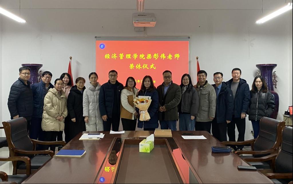 在会议室为梁彤伟老师举办了荣休仪式,温情欢送梁老师光荣退休。离退处处长郭亚红、学院领导班子、国际贸易系全体教师出席了会议,会议由学院党委书记李向东主持。
