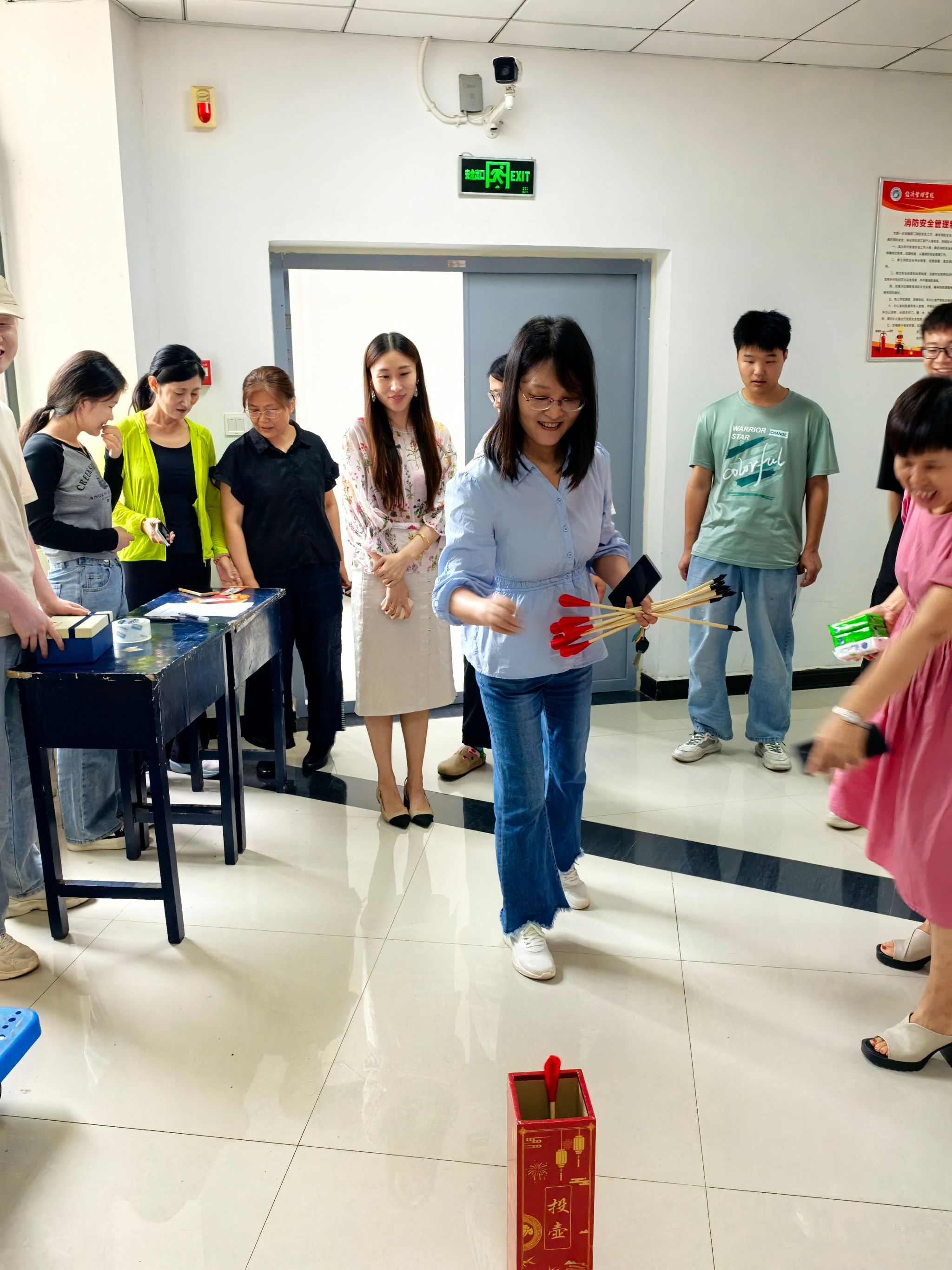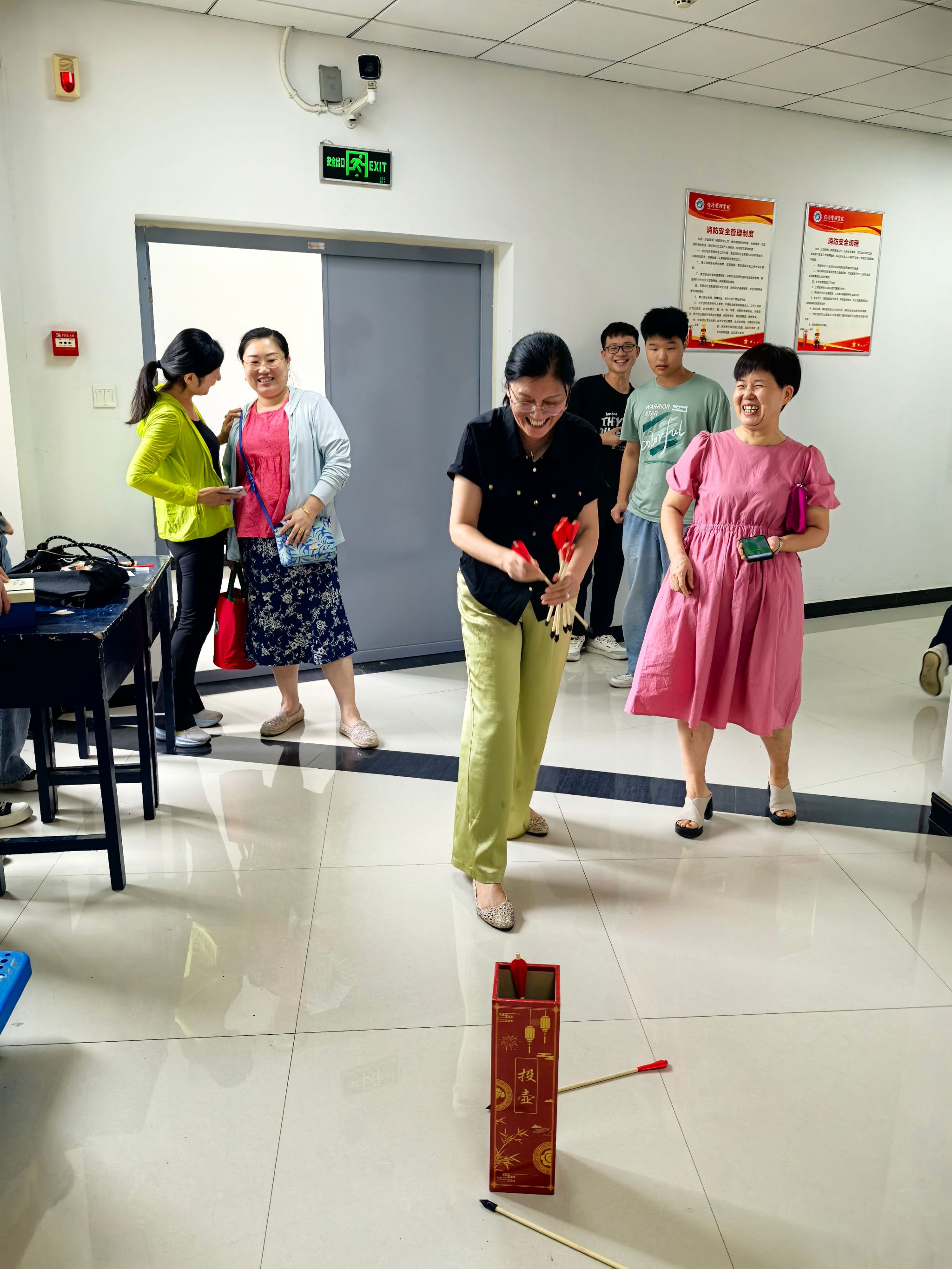 “投壶习礼仪,箭矢定中心。”投壶不仅是一种娱乐,更是一种礼仪的体现。老师们全神贯注,瞄准壶口,力求箭矢精准入壶,每中一次,现场便会响起一阵欢呼声,投中壶口的老师也会获得一次抽奖机会,赢取一份的精美礼品。