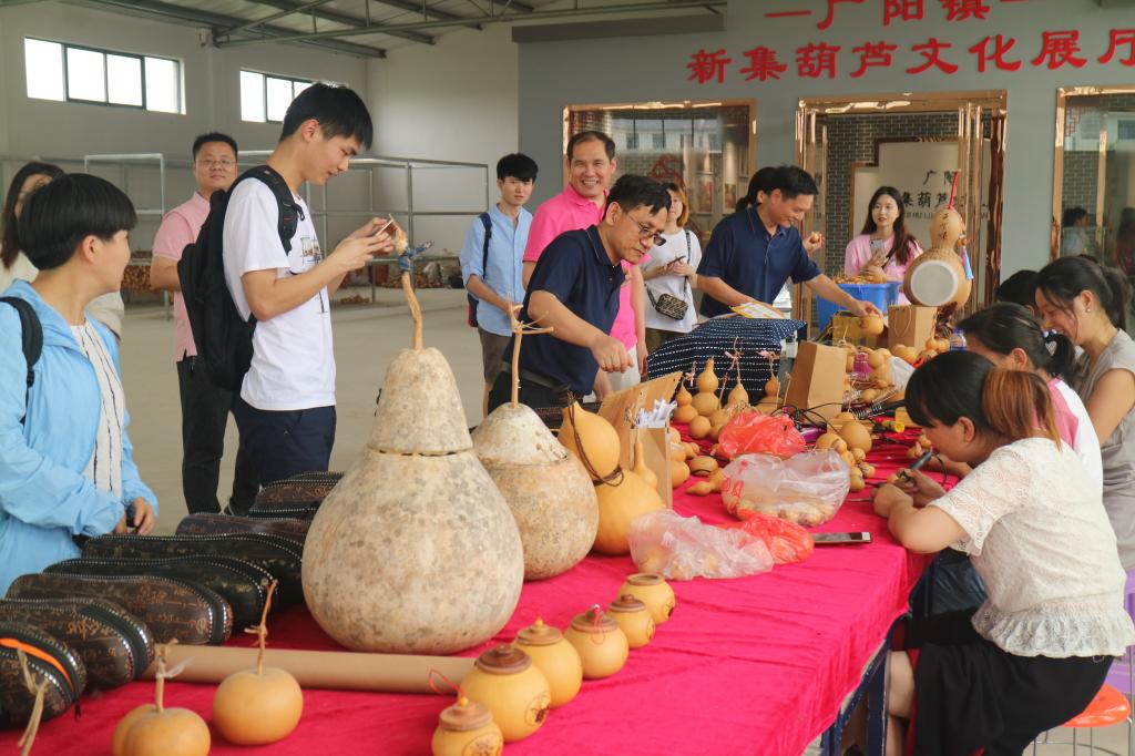 随后,扶贫团一行深入乡村进行了走访调研。对党的建设情况进行了调研,对村容、村貌进行了观察。重点走访了扶贫产业葫芦种植园,实地考察葫芦种植规模、产量、技术与葫芦长势,看到长势喜人的串串葫芦,一行人很受鼓舞,增加了校村合作构建长效扶贫机制的信心。扶贫团重点调研了新集村葫芦产业发展情况。参观了葫芦文化展厅,现场观摩了葫芦烙画工艺技术,与企业负责人及葫芦烙画传人进行了深入交流,提出了许多建设性的发展建议。扶贫团现场购买了部分精美的葫芦烙画艺术品。学院杨文乐老师以庆祝七一为主题现场进行了慰问演出,演唱歌曲《在希望的田野上》迎得现场村民、职工及师生的热烈掌声。