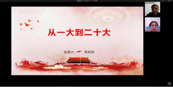 李向东回顾了中国共产党全国代表大会历次大会的召开情况,重点讲述了党的一大到七大的历史背景、关键人物和重大意义,介绍了毛泽东思想、邓小平理论、“三个代表”重要思想、科学发展观和习近平新时代中国特色社会主义思想确立为党的指导思想并写入党章的经过,从历次党代会党员和代表的人数变化展示了中国共产党由小到大、由弱变强的发展过程,从中国共产党百年奋斗的历程中,歌颂了党领导人民取得的丰功伟绩和辉煌成就。