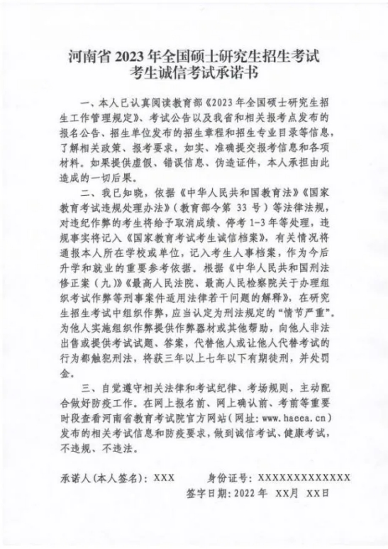 5.考生本人签名的《河南省2023年全国硕士研究生招生考试考生诚信考试承诺书》(请登录网址:www.haeea.cn/attach/file/20220923/20220923172242_2200_c890f2fa.pdf查看下载)。