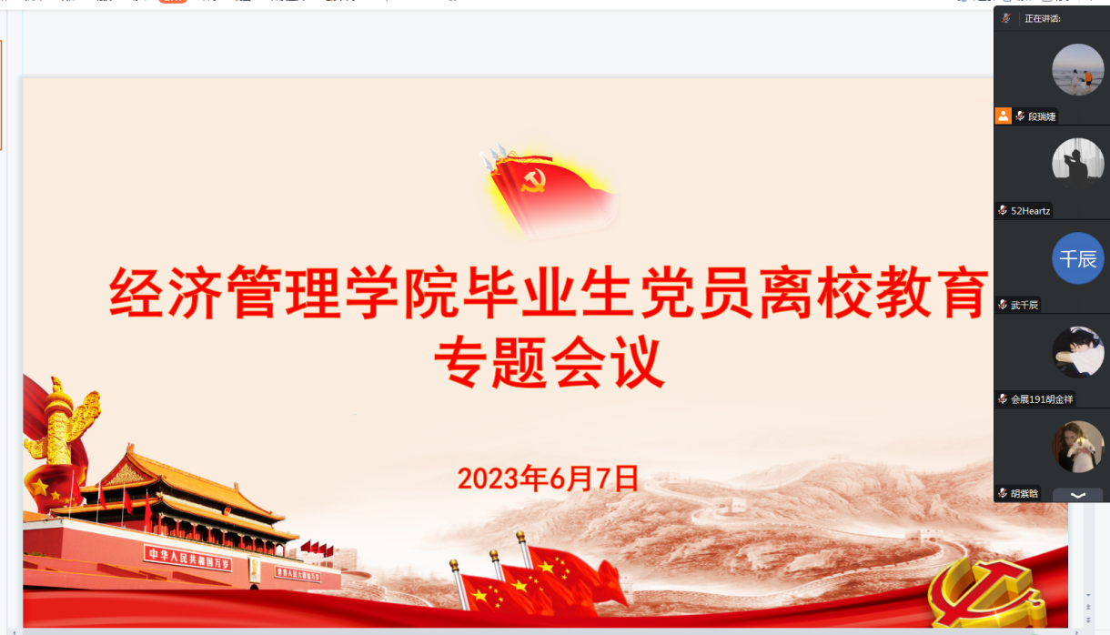 召开毕业生党员离校教育线上专题会议,会议由学院副科级组织员段瑞婕主持,学院党委书记李向东、副书记王琳、各学生支部书记、2019级全体毕业生党员参会。