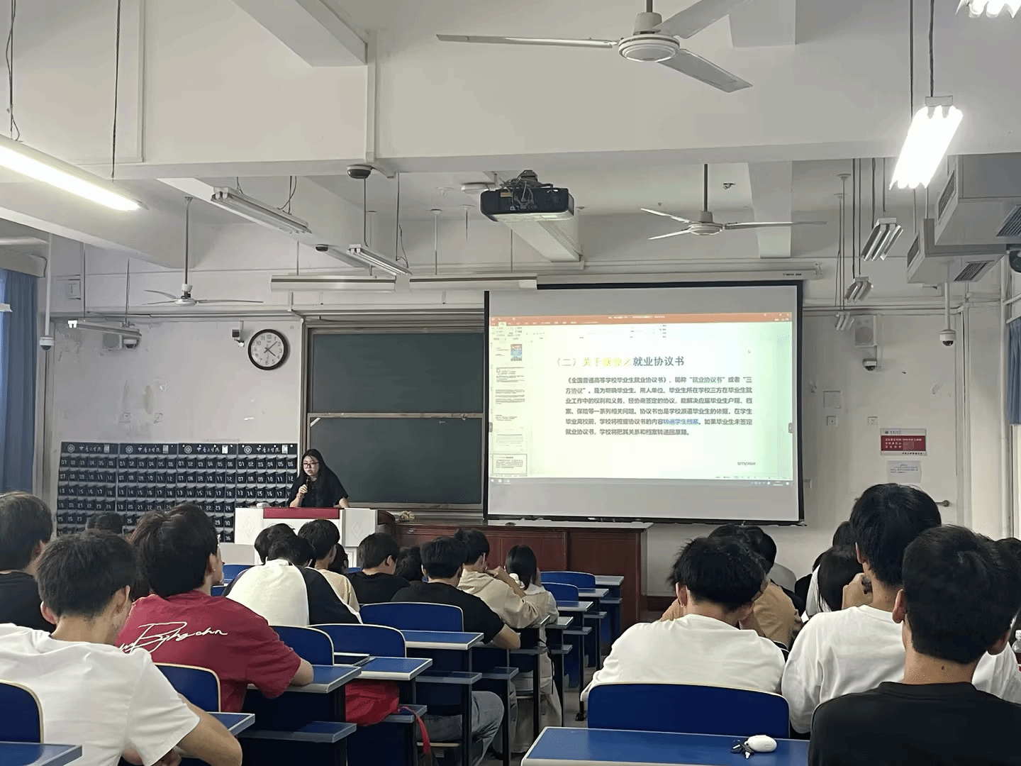 会上,各位毕业班辅导员详细讲解了毕业生需满足的各项条件,包括学分要求及实习要求等,并提醒学生们注意提交毕业材料。在就业求职环节,为毕业生们分析了当前就业市场的趋势,揭示了就业过程中可能遇到的陷阱,如虚假招聘信息、不合理合同条款等,提醒学生们提高警惕,保护自身权益。针对有意向继续深造的学生,详细介绍了考研考公形势、报名流程等信息,在心态调整方面着重分析引导。此外,还为毕业生们介绍了入伍的基本条件、报名流程、选拔标准以及国家对入伍大学生的优待政策。