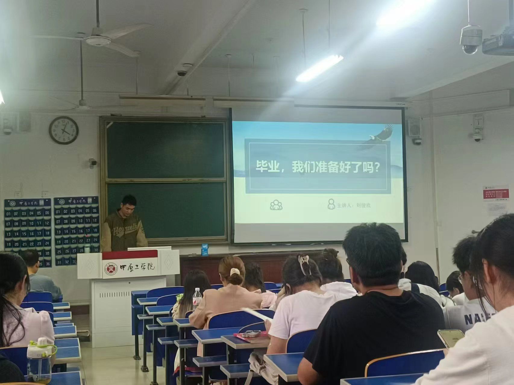 毕业生辅导员杨文乐、张丹、郭兆贤、刘俊欢分别主持会议,全体毕业生参与年级大会。此次会议旨在帮助即将步入社会或继续深造的学生们审视自我准备情况,规划未来道路,增强信心与动力。
