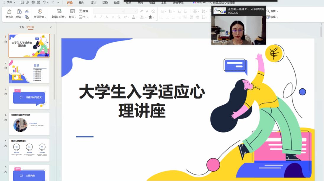 杨文乐对新生开展入学适应心理讲座。重点介绍如何走好大学第一步,分析在大学生活中主要面临的心理问题以及处于心理危机时如 何处理等内容。