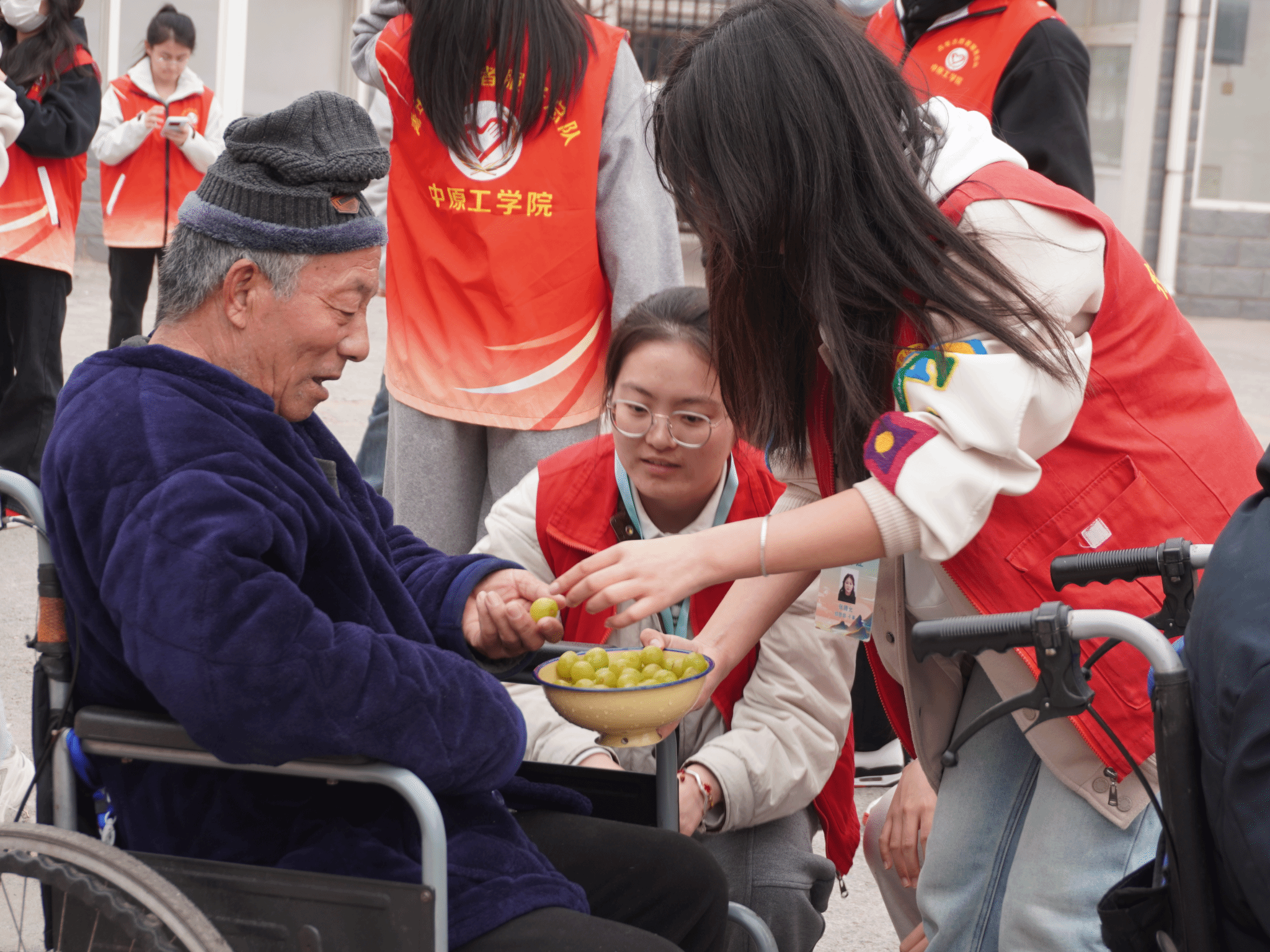 忙碌过后,志愿者们围坐在老人身旁,亲切地用河南话与他们拉起家常。遇到行动不便的老人,志愿者们小心地推着轮椅,陪着他们到户外去晒晒太阳。阳光洒在每个人的身上,勾勒出一幅和谐美好的画面,敬老院里充满了欢声笑语,洋溢着浓浓的温情。