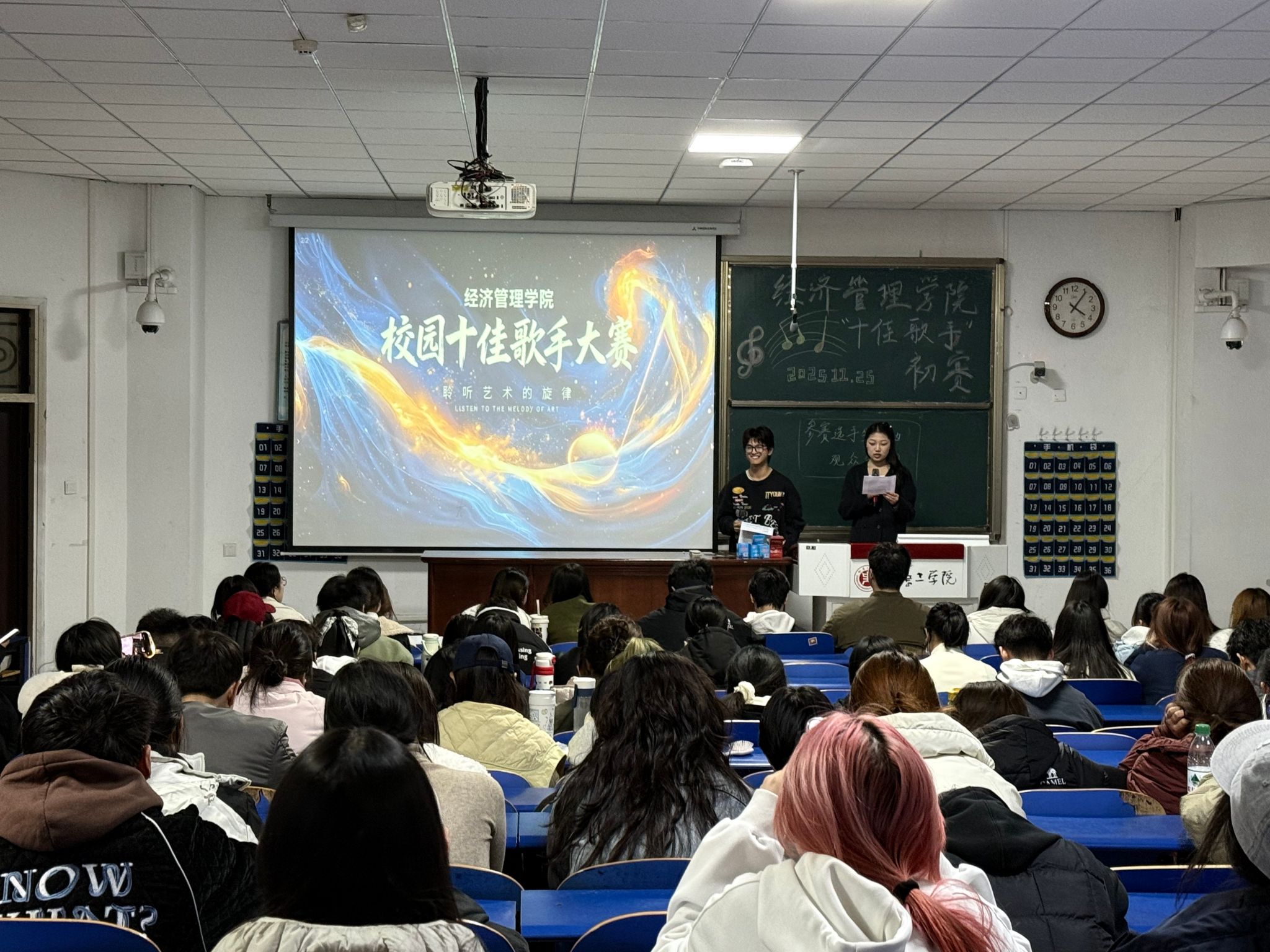 校园十佳歌手大赛初赛在龙湖校区四号教学楼101室火热开启。本次大赛以“青春飞扬 音你而唱”为主题,吸引了数百名怀揣音乐梦想的学子踊跃报名,最终多位选手站上初赛舞台,用歌声点燃了冬日的激情,为现场观众带来了一场精彩纷呈的视听盛宴。