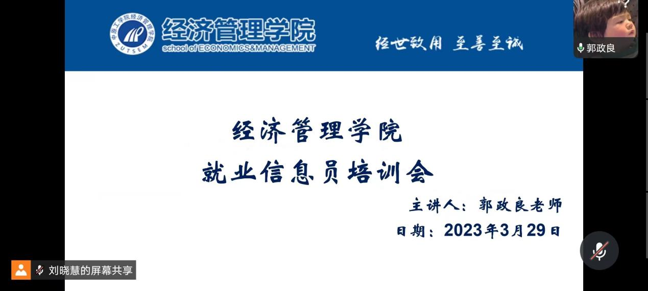 为进一步做好2023届毕业生就业工作,3月29日晚,经济与管理学院于线上举行了2023届毕业生班级就业信息员培训会。毕业班辅导员郭政良老师及2023届毕业生就业信息员参加此次会议。